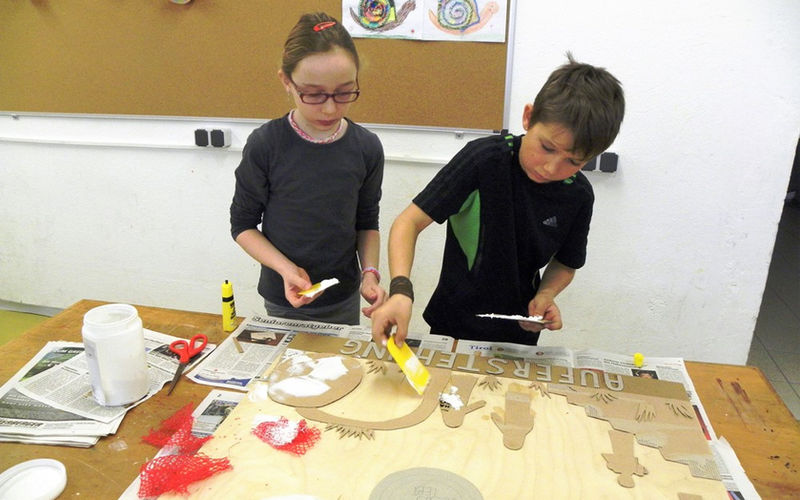 Anordnen, Kleben, Spachteln, Grundieren und die großen Flächen bemalen - das alles konnten die Kinder bewältigen.