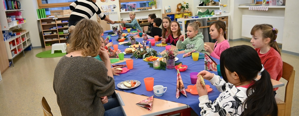 Nach dem Gottesdienst wartete in der Schule das Frühstück, das die Eltern für jede Klasse in der jeweiligen Stammklasse vorbereitet hatten - mit passendem Tischschmuck, Kakao, Tee, Saft, Nutellabrot, Marmeladebrot, Obst,... das Frühstück schmeckte und dauerte in die erste Unterrichtsstunde hinein.