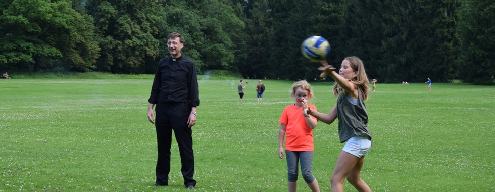 Und danach fuhren wir zur Kaffeejause in den Park von Schloss Hellbrunn, wo die Kinder und Jugendlichen nicht müde wurden zu spielen: Völkerball, Seilhüpfen, Taue ziehen, Fußball - alles stand auf dem Programm. Und die Erwachsenen schauten dem Treiben zu und freuten sich über den schönen Tag, an dem uns bei aller Fröhlichkeit etwas Wehmut begleitete, da dieser Ausflug wieder ein bisschen Abschiednehmen bedeutete: Es war der letzte Ausflug mit Herrn Pfarrer Rainer Hangler. Darum danken wir ihm an dieser Stelle besonders, dass er uns begleitete, sich Zeit für uns nahm und die Messe mit uns feierte.