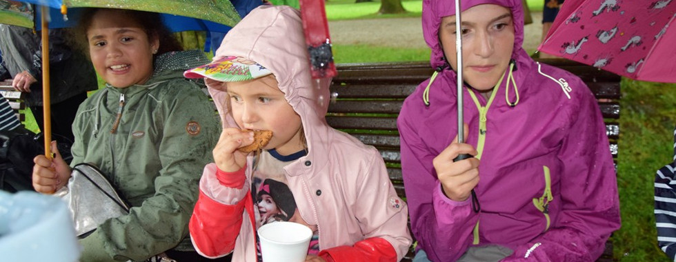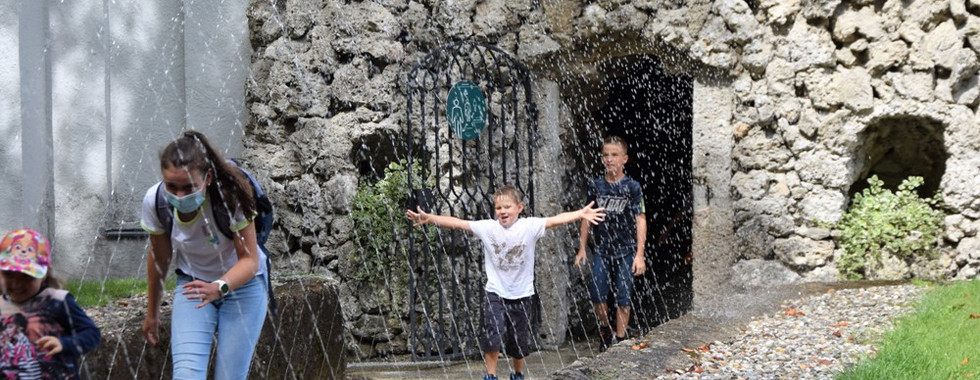 Anschließend machten wir uns bei bewölktem Himmel auf den Weg zu den Wasserspielen im Schlossgarten von Hellbrunn. Dort blieben nicht viele trocken, denn wie bekannt, spritzt aus vielen Ecken Wasser. Die Mütter hatten gut vorgesorgt und Kleidung zum Wechseln mitgenommen. Den letzten Programmpunkt bildete Spiel und Jause im Park. Kaum waren die Bänke und Tische aufgestellt, Kuchen und Kaffee gekostet, zogen dunkle Wolken auf. Der einsetzende Platzregen ließ uns unter den Bäumen Schutz suchen und die Regenschirme wurden aufgespannt. Fröhlich jausneten wir weiter. Und als der Regen nachließ, wagten sich die Kinder auf die Spielwiese - am Seilziehen fanden sie am meisten Spaß.