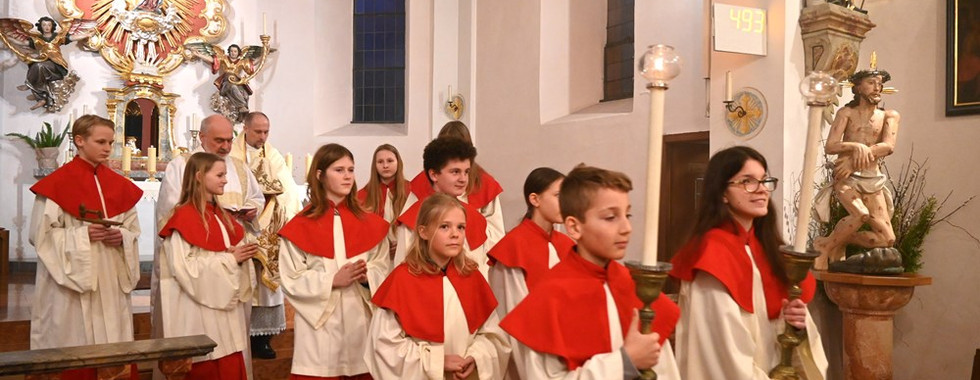 In der Karwoche ist die Feier vom Letzten Abendmahl jene Messe, die sehr festlich beginnt und bei der das Gloria, anders als sonst in der Fastenzeit, gesungen wird. Dazu werden die Sakristeiglocke und die Altarglocken noch einmal kräftig geläutet. Nach dem Gloria verstummen die Glocken und auch die Orgel – es wir stiller, aber ebenso feierlich weitergefeiert. Herr Pfarrer Stefan Schantl betrachtete in der Ansprache das erste Pessach, den Vorübergang des Herr, als Vorausbild für die Eucharistie. Da wird kein Lamm geschlachtet, sondern Jesus nimmt aus Liebe zu uns den Tod auf sich. Erlösungsbedürftig sind wir alle, aber besonders jene, denen Gott ganz ferne ist, die sich gegen ihn entscheiden. Ein weiterer Gedanke galt dem Dienen – Jesus hat den Jüngern die Füße gewaschen und vorgelebt, wie wir einander dienen sollen. Nach der Eucharistiefeier wird im letzten Teil der Liturgie das Allerheiligste im sogenannten Ölberggang in den Kerker gebracht. Anschließend folgt die Ölbergwache, in der wir bei wachen und beten, wie es Jesus von den Jüngern verlangt hat.