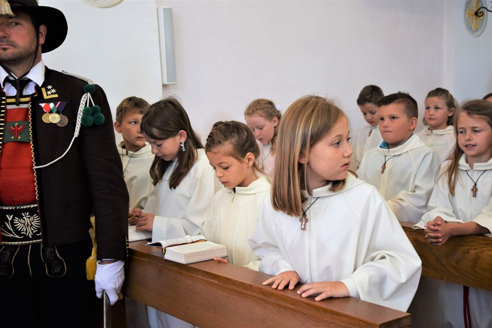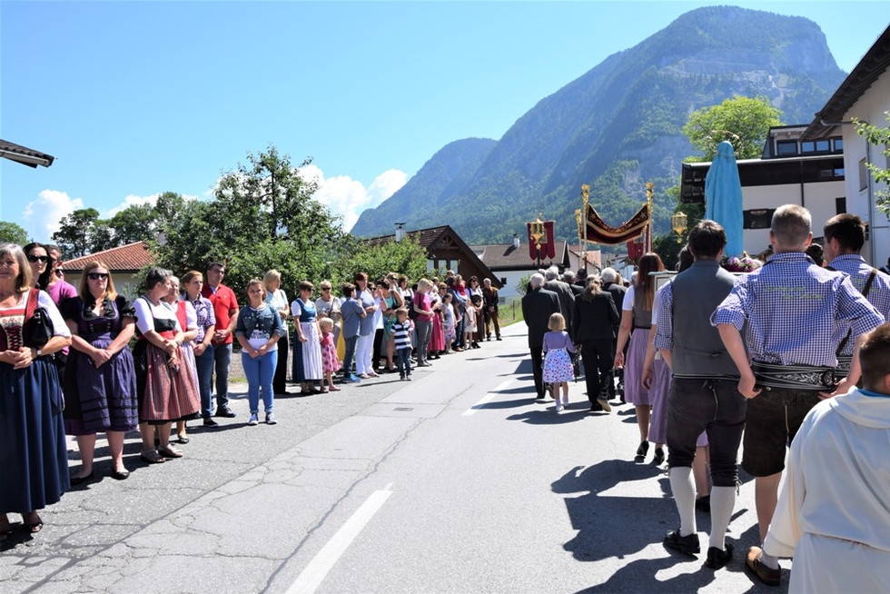 Die festliche Prozession, in der der Herr Kaplan den Leib Christi in der Monstranz trug, mit den Himmel-Trägern, den Ministranten, mit den Fahnenträgern, den Traditionsvereinen, mit den Frau-Trägerinnen, den Jungfrau-Trägerinnen, den Erstkommunionkindern und Schulkindern, Firmlingen und ihren Familien, mit Männern und Frauen führte zu den schön geschmückten Altären in Richtung Schönau, wo wir festlich Station hielten, den Evangeliumstext hörten, Fürbitten sprachen, musikalisch umrahmt vom Kirchenchor und der KMK Bad Häring, wo jeweils eine Ehrensalve der Schützenkompanie ertönte und wo der eucharistische Segen für die Menschen und den Ort gespendet wurde.