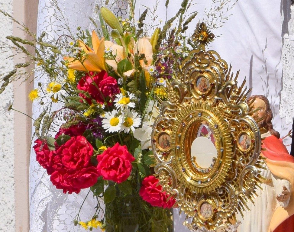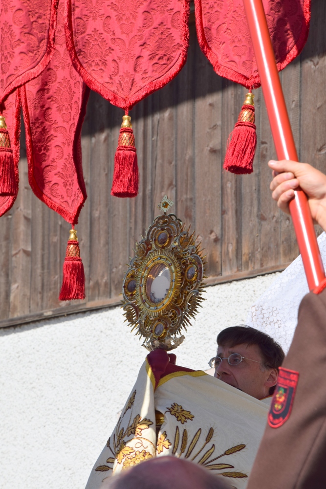 Fronleichnam ist jenes Fest, das uns die Gegenwart Gottes in unserer Zeit immer wieder besonders zu Bewusstsein bringt - die feierliche Messgestaltung durch die Inzensierung des Altares, des Lektionars und der Gaben, die goldfarbene Priesterkleidung, die musikalische Gestaltung durch den Kirchenchor, die Ehrerbietung der Schützenkompanie und das Mitfeiern von vielen Gläubigen tragen dazu bei, die Beziehung zu Christus zu vertiefen und auch die Beziehungen untereinander als Kirche des einen Leibes, wie es in der Lesung heißt.