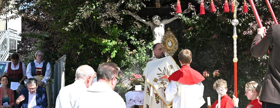 Die anschließende Prozession war eine sehr würdige Feier, bei der Herr Pfarrer Stefan Schantl an vier Stationen mit dem Allerheiligsten den eucharistischen Segen spendete, um Schutz zu erbitten vor Unwetter und Unheil und um die Arbeit der Menschen gute Früchte tragen zu lassen. Vor dem Te Deum bedankte sich Herr Diakon Franz Reinhartshuber bei allen für dieses Zeugnis des