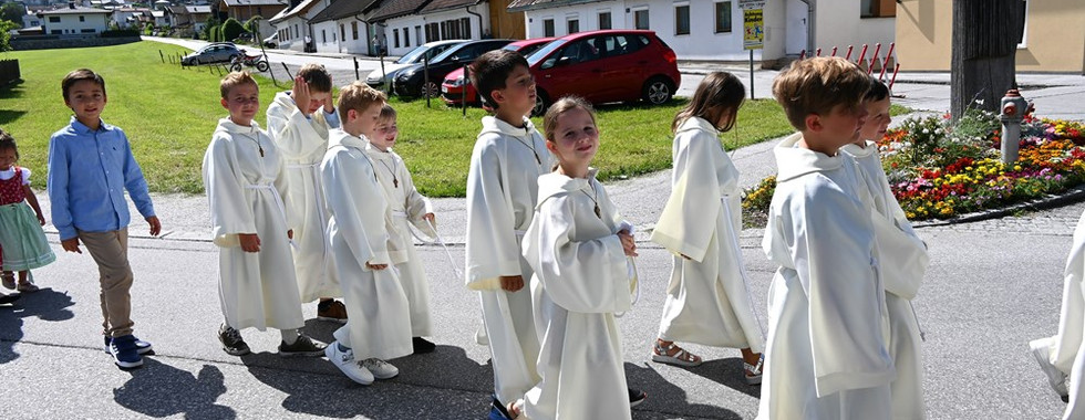 Zu Fronleichnam erweist die Schützenkompanie dem eucharistischen Leib bereits bei der Messe ihre besondere Ehre - Herr Pfarrer Stefan Schantl begrüßte sie und freute sich auch über die Erstkommunionkinder, die noch einmal im liturgischen Kleid mitfeierten.