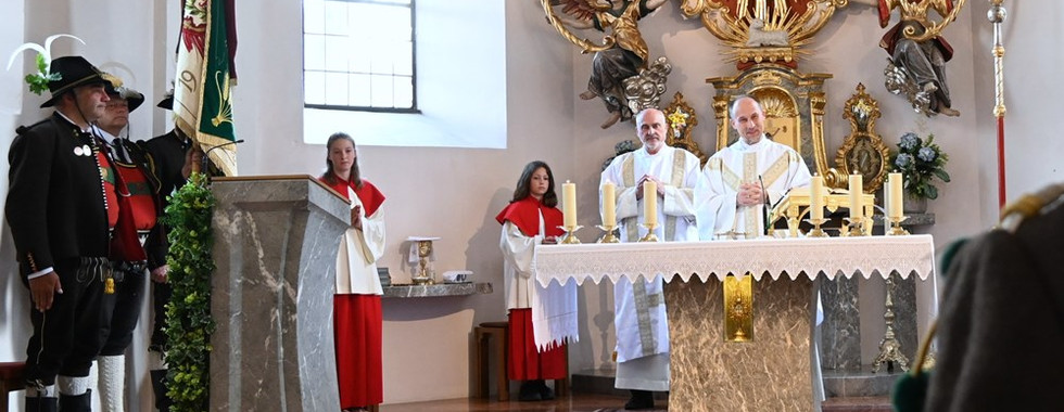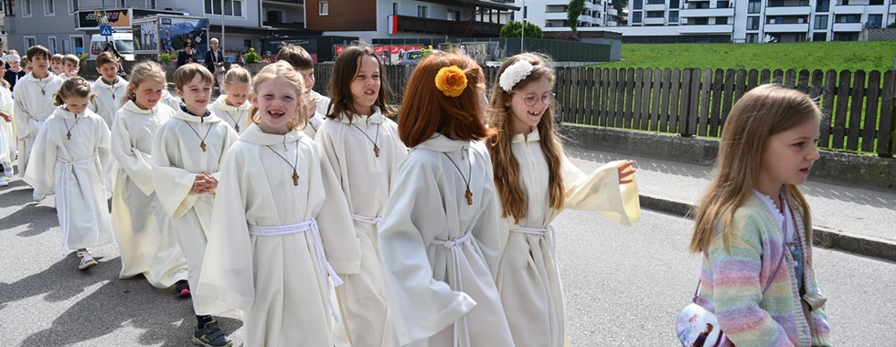 Zur Messe in der Kirche begrüßte Herr Pfarrer Stefan Schantl alle, die gekommen waren - besonders sprach er die Erstkommunionkinder, die Schützen, die Frauen und Landjugend an, die an diesem Tag traditionellerweise vorne ihre Plätze einnehmen bzw. zur Ehre des Allerheiligsten stehend mitfeiern.