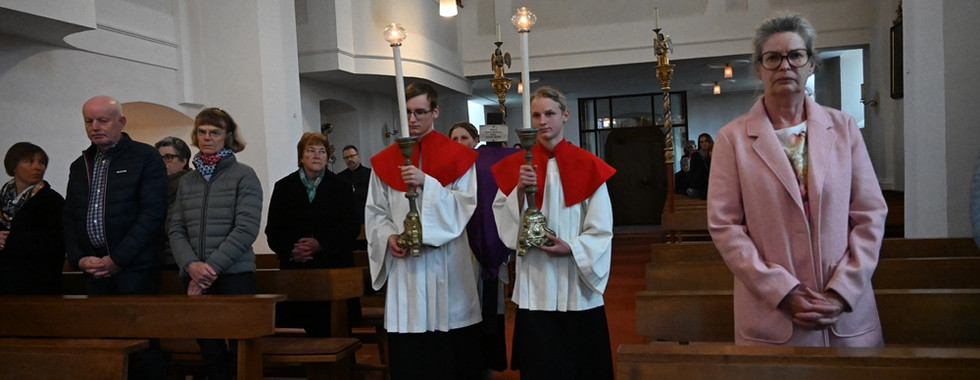Mit einem stillen Einzug in die wenig beleuchtete Kirche begann die Karfreitagsliturgie und zum Zeichen der Demut streckten sich Herr Pfarrer Stefan Schantl und Herr Diakon Stefan Mair auf den Boden hin, während die Ministranten knieten. Auf das einleitende Gebet folgten unmittelbar die Lesungen und anschließend wurde die Passion nach Johannes mit verteilten Rollen vorgetragen. In den großen Fürbitten baten wir für die heilige Kirche, für den Papst, für alle Stände der Kirche, für die Taufwerber, für die Einheit der Christen, für die Juden, für alle, die nicht an Christus glauben, für alle, die nicht an Gott glauben, für die Regierenden und für alle notleidenden Menschen. Nach jeder Bitte war die Feiergemeinde zur Kniebeuge eingeladen.