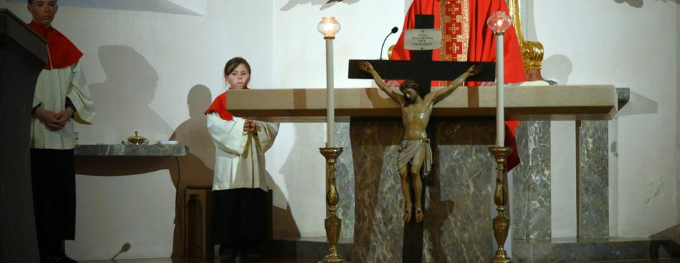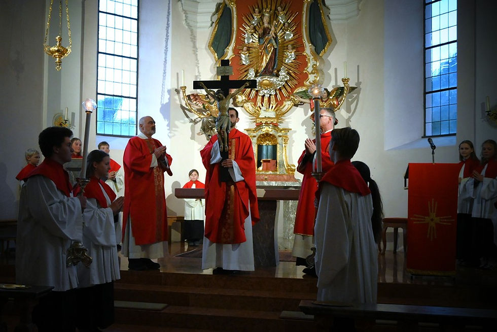 Nach der Stille sprach Herr Kooperator Klaus Pirchmoser das Eröffnungsgebet und es folgten die Lesungen. Anschließend wurde die Passion mit verteilten Rollen vorgetragen. In der Predigt lenkte Herr Kooperator Klaus Pirchmoser unsere Gedanken zum Kreuz, zu den Kruzifix-Darstellungen. Wie bedeutend muss Jesus Tod im Vergleich zu den vielen anderen Kreuzigungen gewesen sein, wenn man dies heute noch so häufig darstellt. Welche Bedeutung hat das Kreuz für uns persönlich? Manche Menschen ehren das Kreuz sehr, manche gehen eher achtlos vorüber, ohne daran zu denken, dass Jesus aus Liebe für uns gestorben ist. Und manche würden am liebsten alle Kreuze entfernen, in den Räumen, auf den Bergspitzen und entlang der Wege. Ein Kreuz und seine Verehrung kann uns helfen, uns der Liebe Gottes zu uns Menschen, zu einem selbst, neu bewusst zu werden. Dieser Liebe sollten wir uns öffnen und sie weitergeben. Es soll unsere freie Entscheidung für Gott sein, denn er zwingt uns zu nichts. So dürfen wir an diesem Tag das Kreuz bewusst verehren, wenn es nach den Großen Fürbitten enthüllt wird. Bei diesen baten wir für die Kirche, den Papst, die Bischöfe und Priester, die Katechumenen, alle Glaubenden, die Einheit der Christen, für die Juden, für alle Nichtgläubigen, für die Regierenden, für die Notleidenden, Kranken und Sterbenden. Anschließend brachten Ministranten in einer feierlichen Prozession das verhüllte Kreuz in den Altarraum, wo Herr Kooperator Klaus Pirchmoser es enthüllte. Danach erfolgte die Verehrung des Kreuzes mit einer Kniebeuge, zuerst durch die Geistlichen und die Ministranten, anschließend durch alle Mitfeiernden.