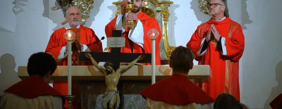 Am Karfreitag wird keine Messe gefeiert, aber wir dürfen trotzdem den Leib Christi empfangen: Herr Diakon Franz Reinhartshuber und Herr Diakon Stefan Mair holten dazu die konsekrierten Hostien aus dem Seitenaltar.