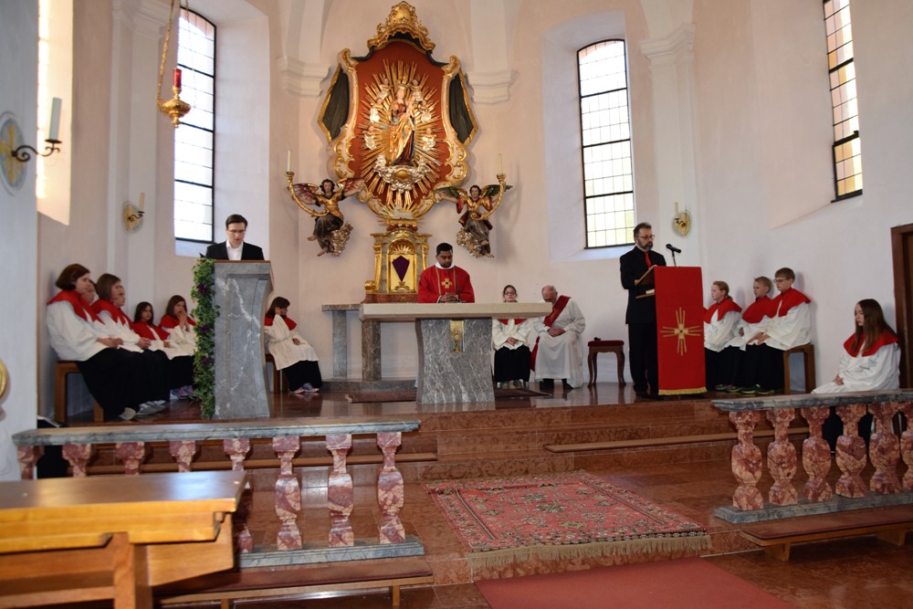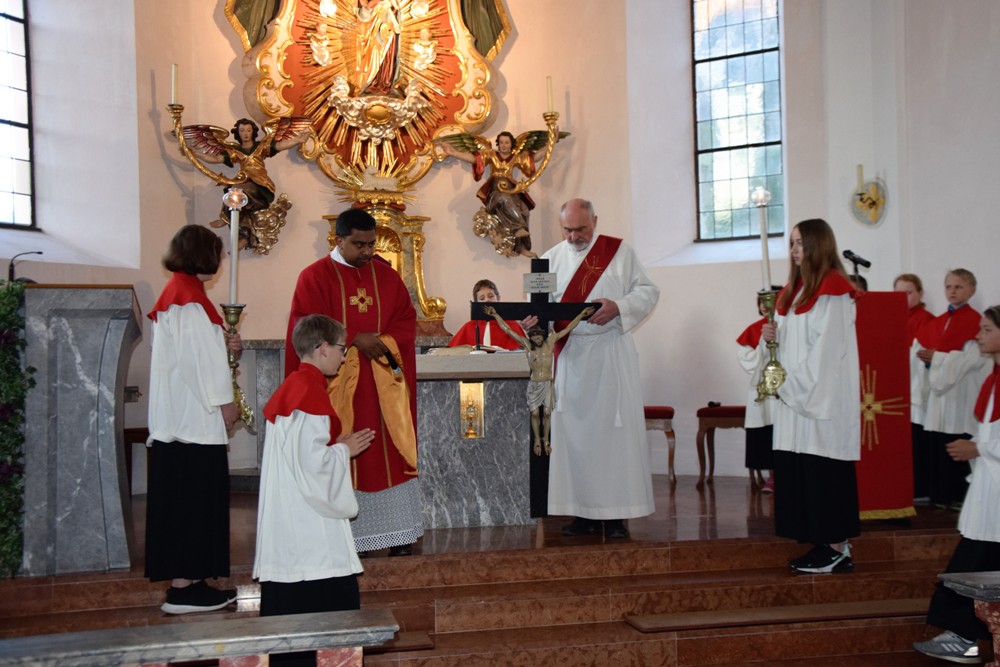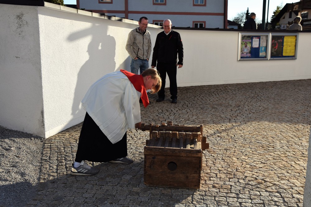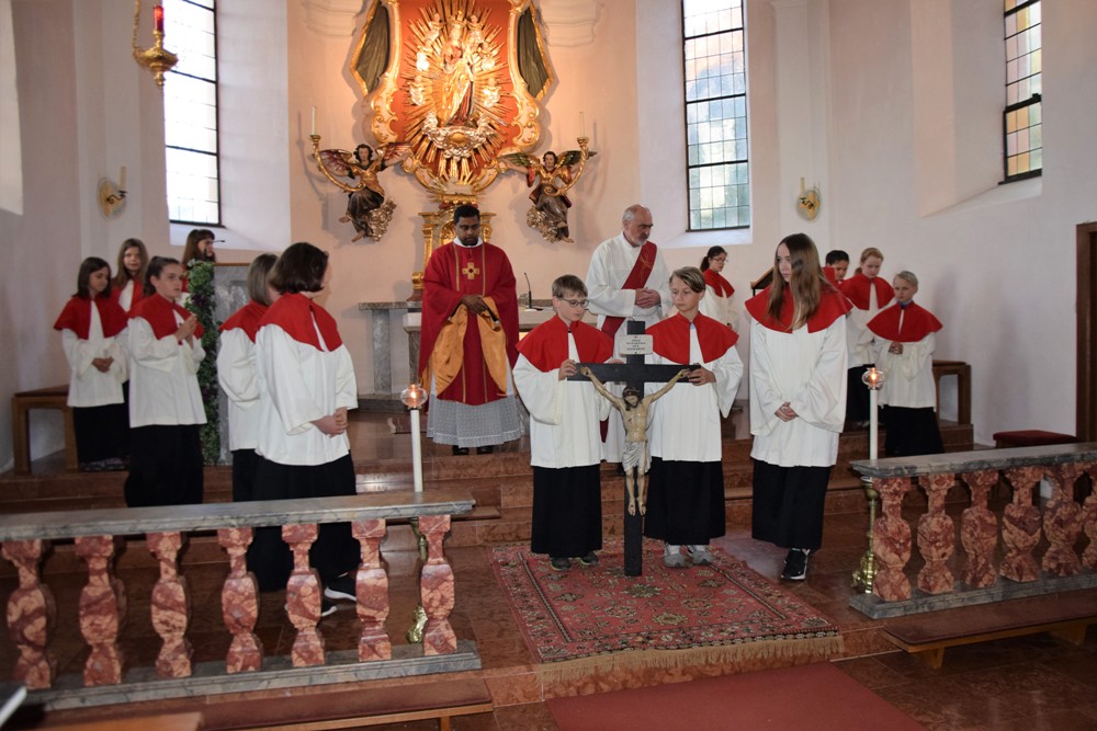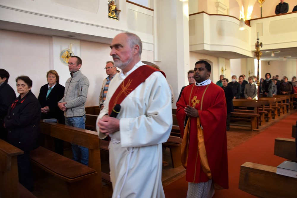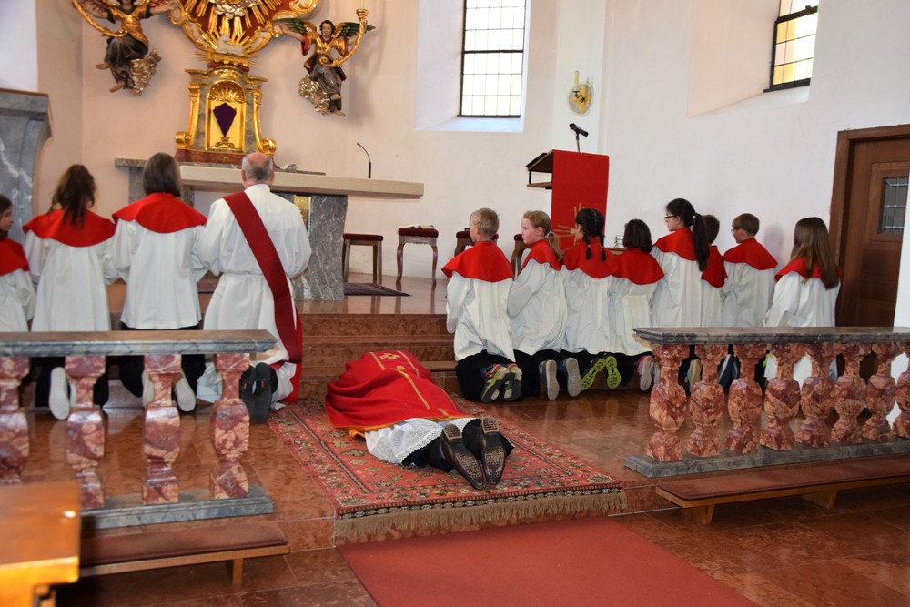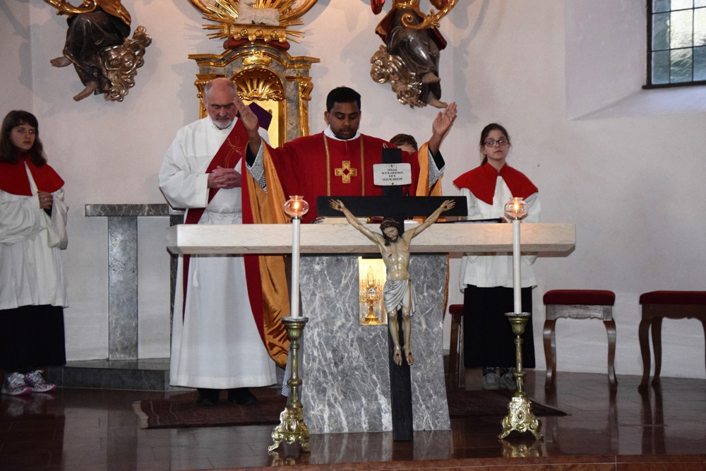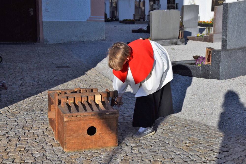 Am Karfreitag kommen die Ratschen zum Einsatz, um zum Gottesdienst einzuladen und den Beginn anzukündigen - eine Aufgabe, die einer der älteren Ministranten als große Ehre gern übernimmt. Die Karfreitagsliturgie zelebrierte ebenfalls Herr Kooperator Binu John für uns. Die Feier beginnt mit einem stillen Einzug des Priesters, des Diakones und der Ministranten, Anschließend folgen die Lesungen, wobei das Evangelium mit verteilten Rollen vorgetragen wird. Die kaum beleuchtete Kirche und der leere Altarraum strahlen eine besondere Atmosphäre aus, in der es gut möglich, sich die Todesstunden Jesu zu vergegenwärtigen. Besonders soll bewusst werden, wie es Herr Kooperator Binu John in seiner Ansprache ausdrückte, dass Gottes Liebe zu uns Menschen so groß ist, dass er uns mit dem Tod und der Auferstehung seines Sohnes in seine Unendlichkeit führen will. Er kommt in Jesus zu uns, um die Schuld von uns zu nehmen und unsere Lasten mitzutragen. Es liegt an uns, an diesen gütigen Vater und seine Treue zu uns zu glauben und ihm zu vertrauen. Nach der Ansprache folgten die großen Fürbitten: Nach der jeweils gesungenen Bitte für die Kirche, den Papst, die Priester und Diakone, die Taufwerber, die Einheit der Christen, die Juden, die Ungläubigen, die Regierenden und die Notleidenden erfolgen das Gebet durch den Priester und die Kniebeuge aller Mitfeiernden.