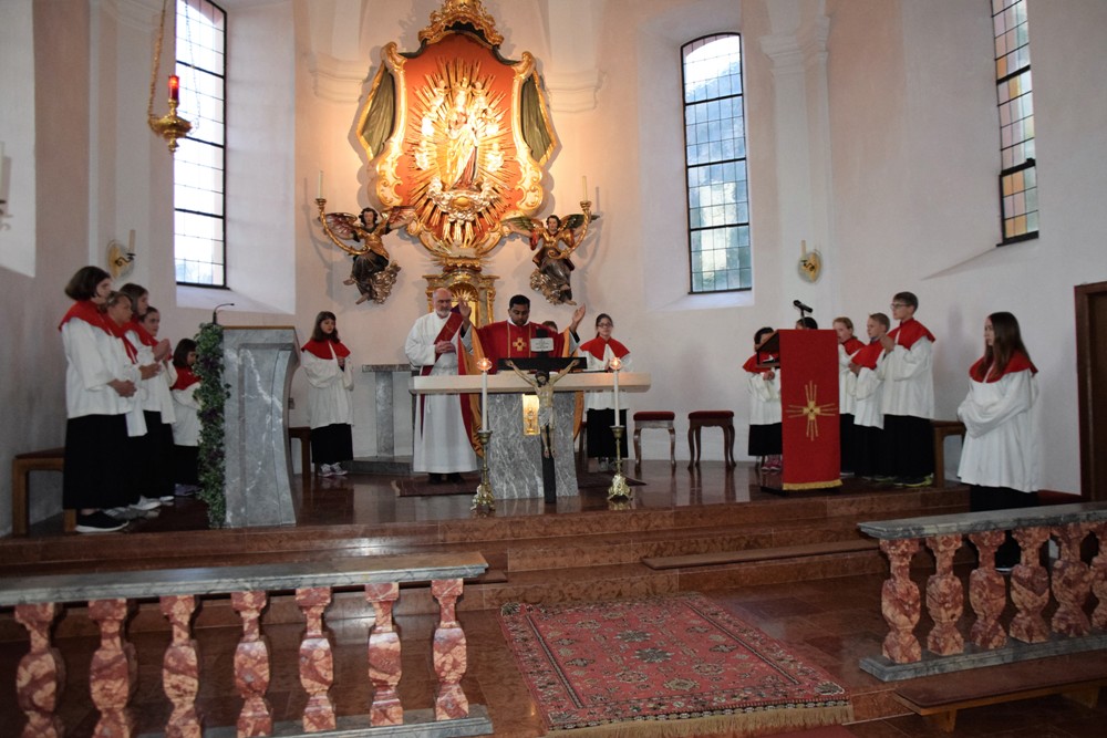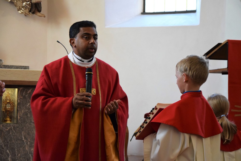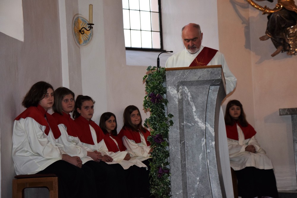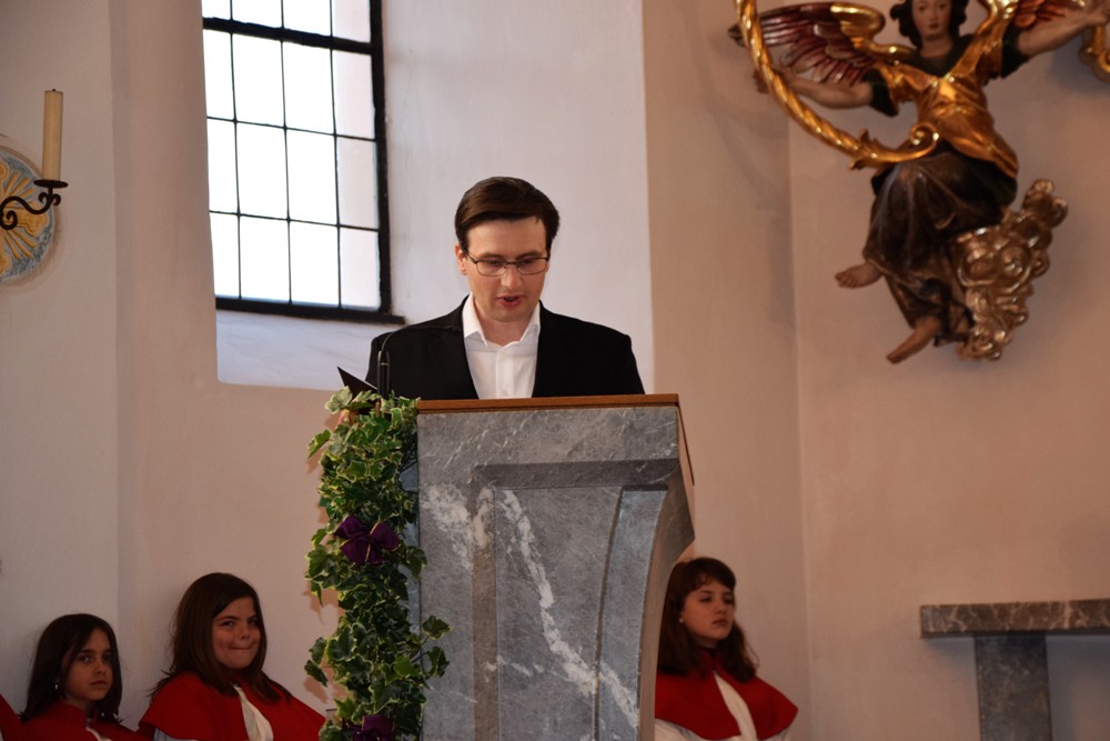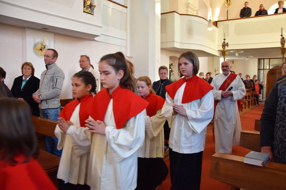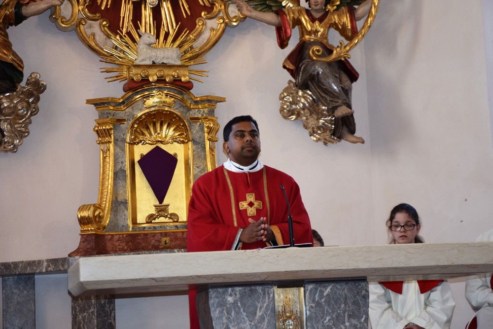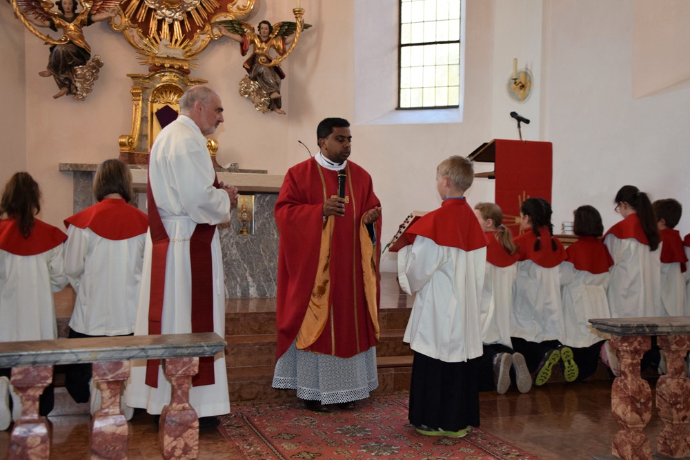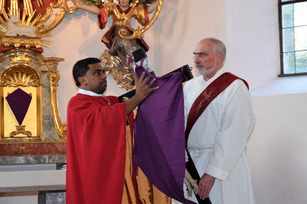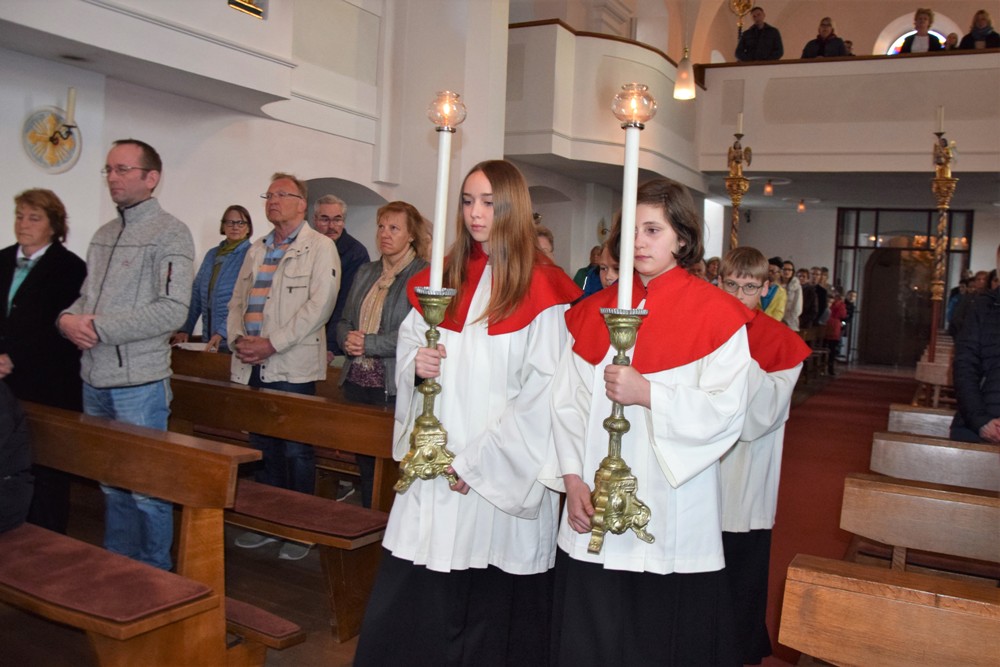 Am Karfreitag kommen die Ratschen zum Einsatz, um zum Gottesdienst einzuladen und den Beginn anzukündigen - eine Aufgabe, die einer der älteren Ministranten als große Ehre gern übernimmt. Die Karfreitagsliturgie zelebrierte ebenfalls Herr Kooperator Binu John für uns. Die Feier beginnt mit einem stillen Einzug des Priesters, des Diakones und der Ministranten, Anschließend folgen die Lesungen, wobei das Evangelium mit verteilten Rollen vorgetragen wird. Die kaum beleuchtete Kirche und der leere Altarraum strahlen eine besondere Atmosphäre aus, in der es gut möglich, sich die Todesstunden Jesu zu vergegenwärtigen. Besonders soll bewusst werden, wie es Herr Kooperator Binu John in seiner Ansprache ausdrückte, dass Gottes Liebe zu uns Menschen so groß ist, dass er uns mit dem Tod und der Auferstehung seines Sohnes in seine Unendlichkeit führen will. Er kommt in Jesus zu uns, um die Schuld von uns zu nehmen und unsere Lasten mitzutragen. Es liegt an uns, an diesen gütigen Vater und seine Treue zu uns zu glauben und ihm zu vertrauen. Nach der Ansprache folgten die großen Fürbitten: Nach der jeweils gesungenen Bitte für die Kirche, den Papst, die Priester und Diakone, die Taufwerber, die Einheit der Christen, die Juden, die Ungläubigen, die Regierenden und die Notleidenden erfolgen das Gebet durch den Priester und die Kniebeuge aller Mitfeiernden.