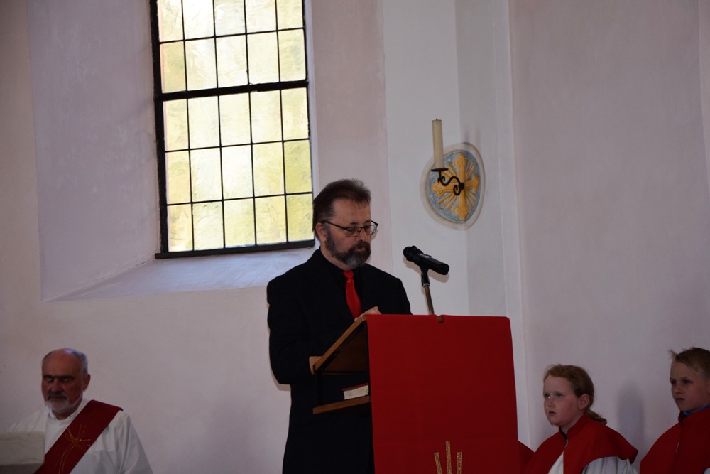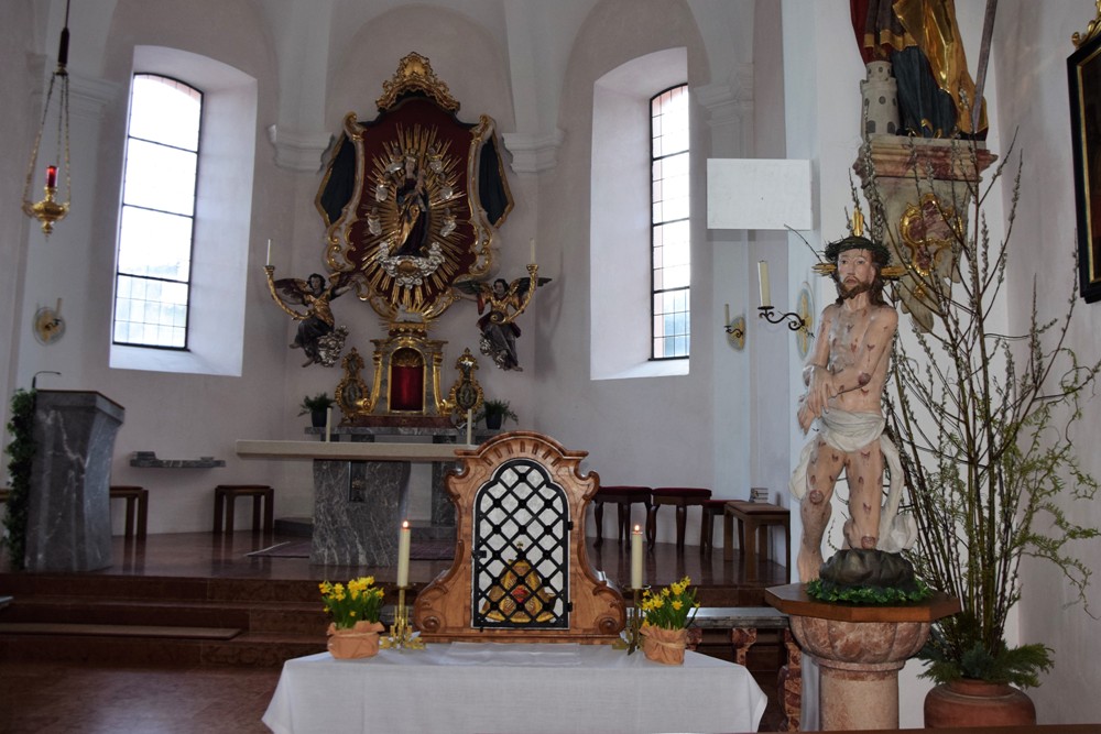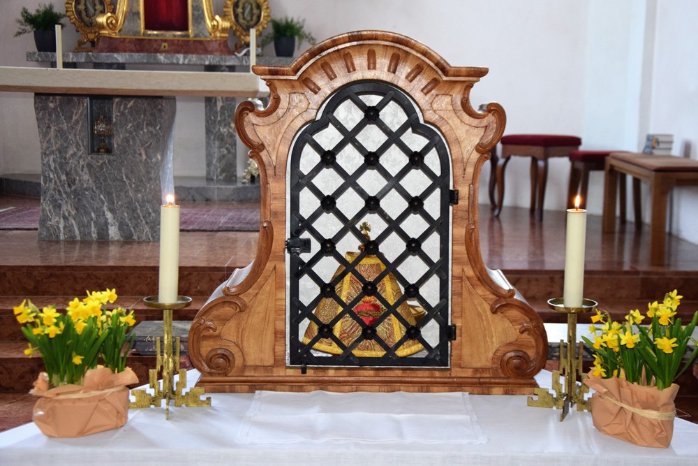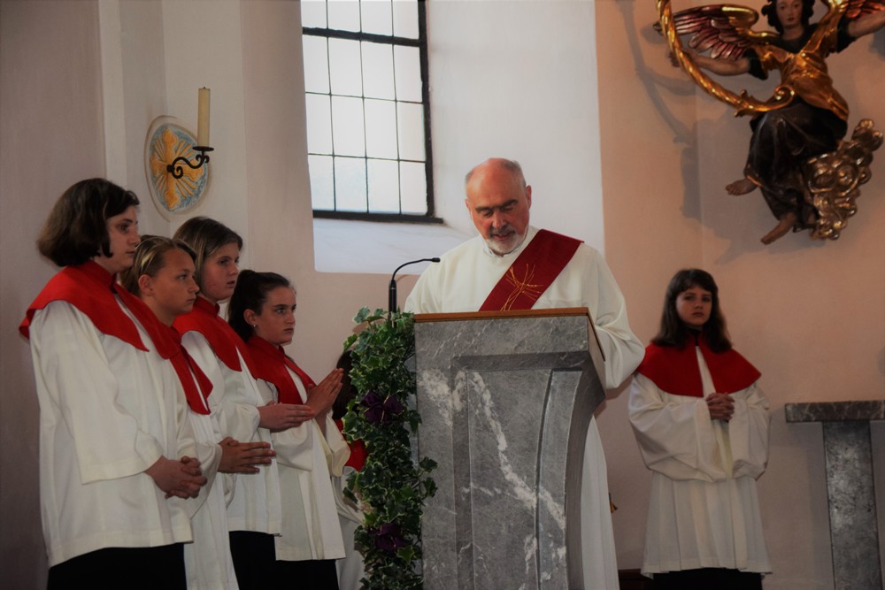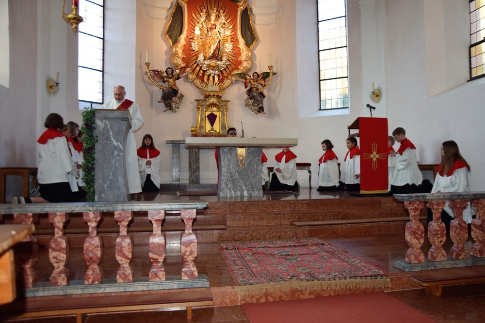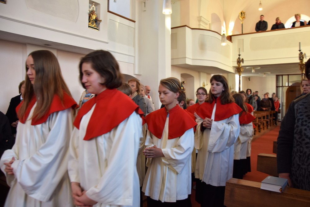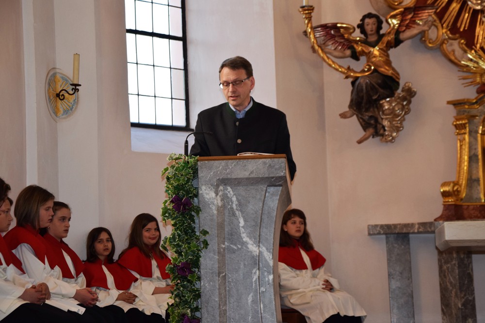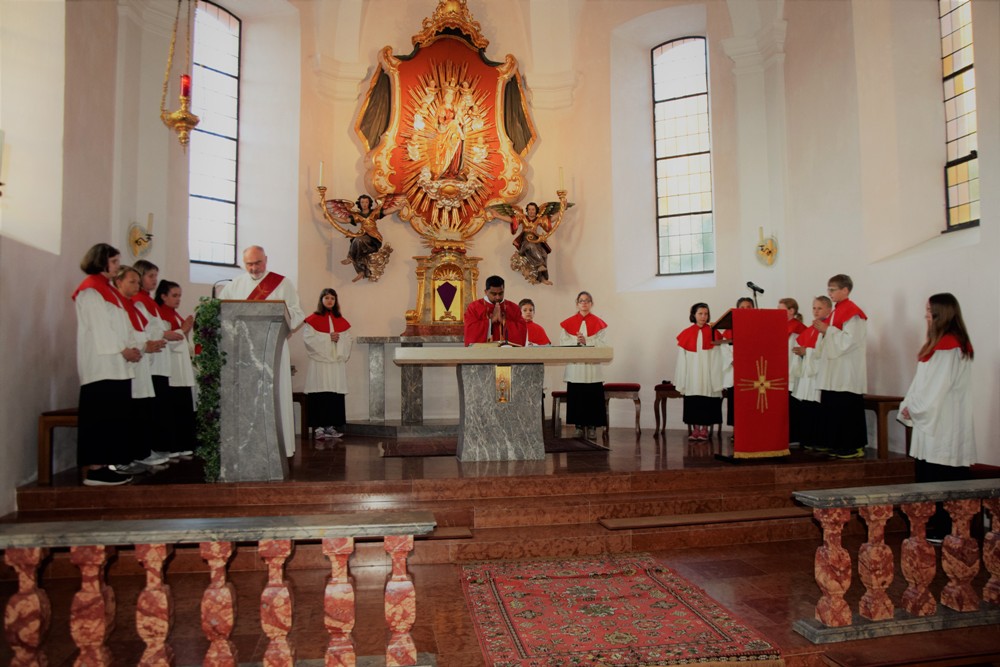 Am Karfreitag kommen die Ratschen zum Einsatz, um zum Gottesdienst einzuladen und den Beginn anzukündigen - eine Aufgabe, die einer der älteren Ministranten als große Ehre gern übernimmt. Die Karfreitagsliturgie zelebrierte ebenfalls Herr Kooperator Binu John für uns. Die Feier beginnt mit einem stillen Einzug des Priesters, des Diakones und der Ministranten, Anschließend folgen die Lesungen, wobei das Evangelium mit verteilten Rollen vorgetragen wird. Die kaum beleuchtete Kirche und der leere Altarraum strahlen eine besondere Atmosphäre aus, in der es gut möglich, sich die Todesstunden Jesu zu vergegenwärtigen. Besonders soll bewusst werden, wie es Herr Kooperator Binu John in seiner Ansprache ausdrückte, dass Gottes Liebe zu uns Menschen so groß ist, dass er uns mit dem Tod und der Auferstehung seines Sohnes in seine Unendlichkeit führen will. Er kommt in Jesus zu uns, um die Schuld von uns zu nehmen und unsere Lasten mitzutragen. Es liegt an uns, an diesen gütigen Vater und seine Treue zu uns zu glauben und ihm zu vertrauen. Nach der Ansprache folgten die großen Fürbitten: Nach der jeweils gesungenen Bitte für die Kirche, den Papst, die Priester und Diakone, die Taufwerber, die Einheit der Christen, die Juden, die Ungläubigen, die Regierenden und die Notleidenden erfolgen das Gebet durch den Priester und die Kniebeuge aller Mitfeiernden.