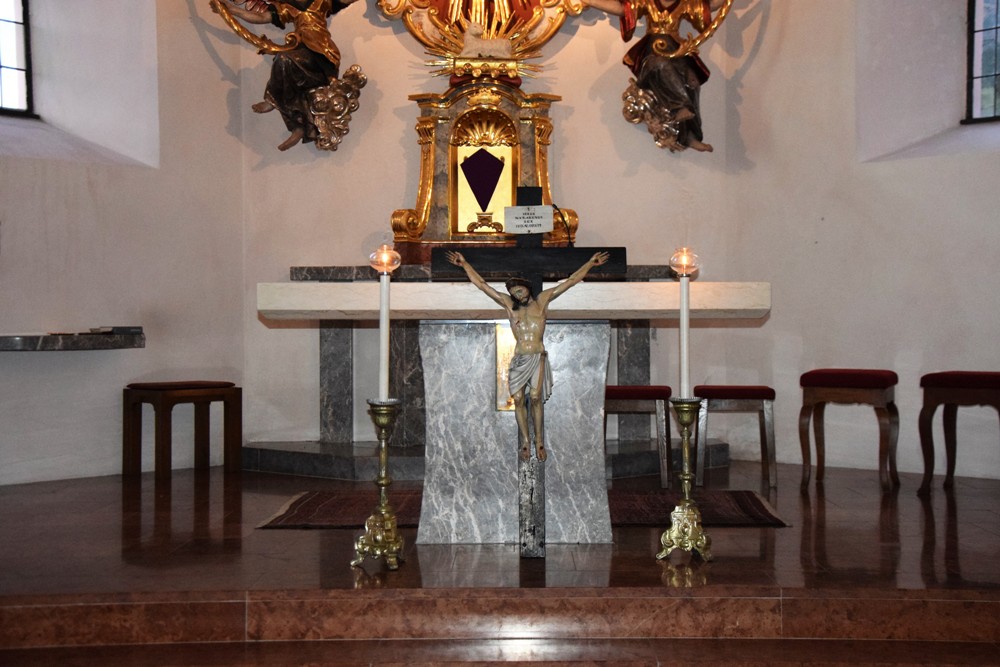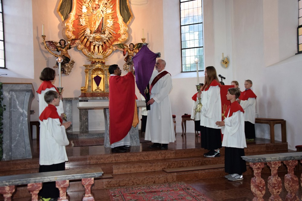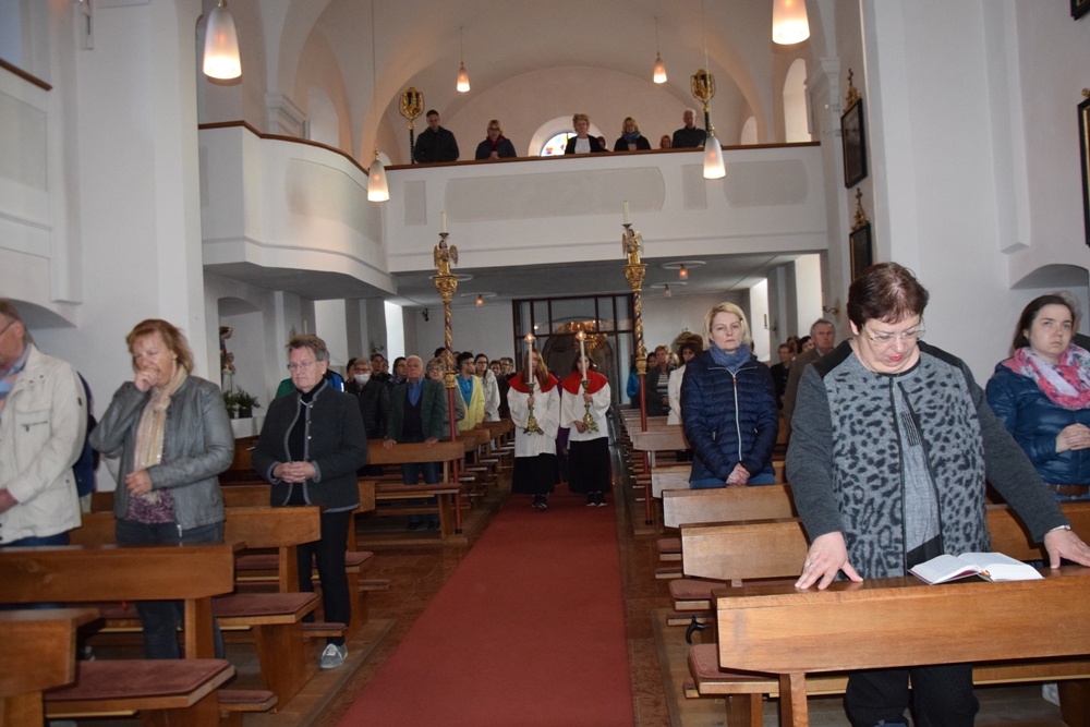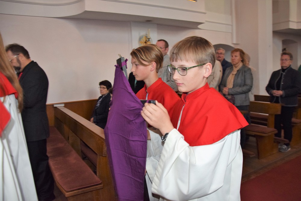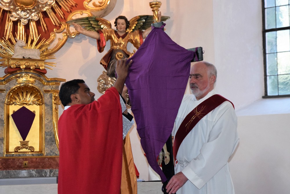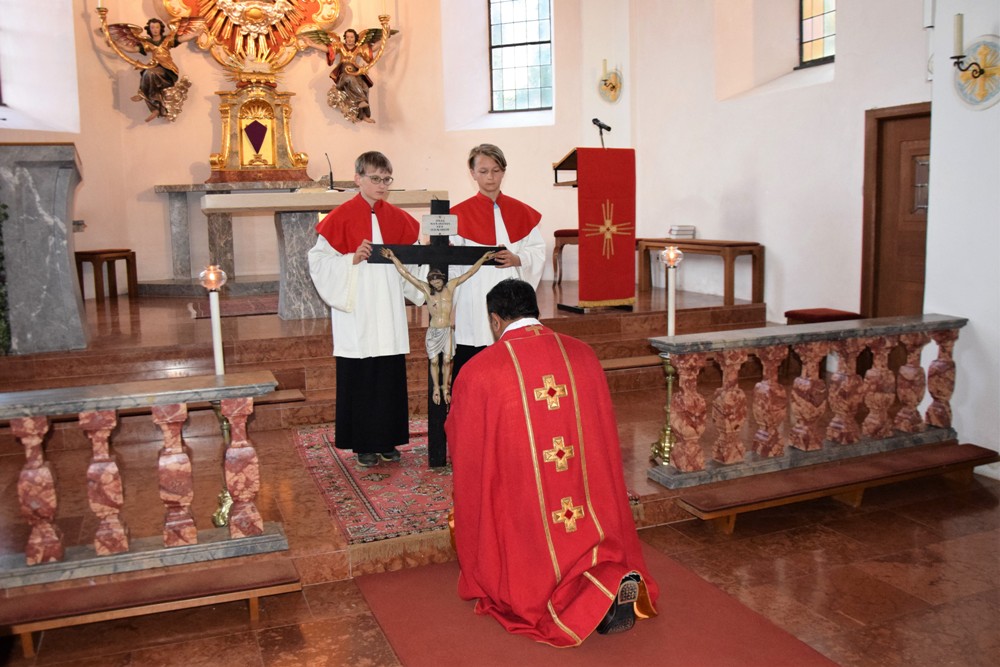 Danach brachten Ministranten in einer Prozession das Kreuz vom Kirchenportal in den Altarraum, wo es enthüllt wurde und anschließend von der Feiergemeinde verehrt - im Bewusstsein, dass Jesus sein Leben für uns hingegeben hat.