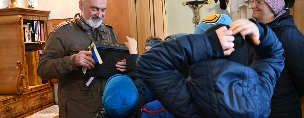 Die Kirchenführungen gehören zu den Gruppenstunden der Erstkommunionvorbereitung - mit einer sehr interessierten Bubengruppe, begleitet von Müttern, erkundete Herr Diakon Franz Reinhartshuber die Pfarrkirche - angefangen beim Portal mit der Darstellung der Heilsgeschichte, über das Kirchenschiff, den Pfarrpatron, das Taufbecken, wichtige Heilige, den Altarraum in die Sakristei, wo es liturgische Gefäße, Bücher und Kleidung zu bestaunen gab, blieb dann noch der Höhepunkt: der Aufstieg in den Turm zu den Glocken.