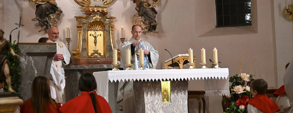 Nach dem Schlusssegen waren alle zum Blasiussegen eingeladen, der vor Halskrankheiten und anderen Krankheiten sowie vor Unheil bewahren möge. Zwischendrin interessierte sich einer der Buben für die Kreuzreliquie im Altarstein, die er sich dann mit Herrn Pfarrer Stefan Schantl ansehen durfte. Auch dafür war Zeit.