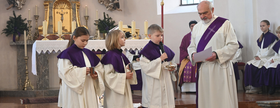 Die neuen Ministranten, drei Buben und drei Mädchen, hatten sich gut auf diesen Tag vorbereitet, indem sie die verschiedenen Ministrantendienste wie Leuchter tragen, Kreuz tragen, Gabenbereitung, Sammeln und Läuten in den Probenstunden mit Herrn Diakon Franz Reinhartshuber geübt hatten und auch schon öfter bei Messen ministriert hatten. An diesem besonderen Tag sprachen sie auch Kyriegedanken und Fürbitten und nach einer Lichterprozession erfolgte eine Gabenprozession mit passenden Texten. Herr Pfarrer Stefan Schantl sprach ein Segensgebet über sie, das sie in Form einer Karte geschenkt erhielten, außerdem durften sie ihre Namenskerze mit nach Hause nehmen und sie freuten sich über die Ministrantenfigur. Wenn Kinder so würdig mitfeiern, mit ihren kurzen Texten zum Nachdenken bringen, achtsam brennende Kerzen tragen und Gaben bringen, so berührt das die Feiergemeinde und Adventstimmung - Erwartung der Geburt Christi - macht sich breit. Frieden und Geborgenheit im Haus des Herrn: Das waren die wichtigsten Worte des Psalms zwischen den beiden Lesungen. Herr Pfarrer Stefan Schantl legte sie uns in seiner Ansprache ans Herz. Das ist es, worauf wir zugehen dürfen und Gott nimmt uns an, wie wir sind.