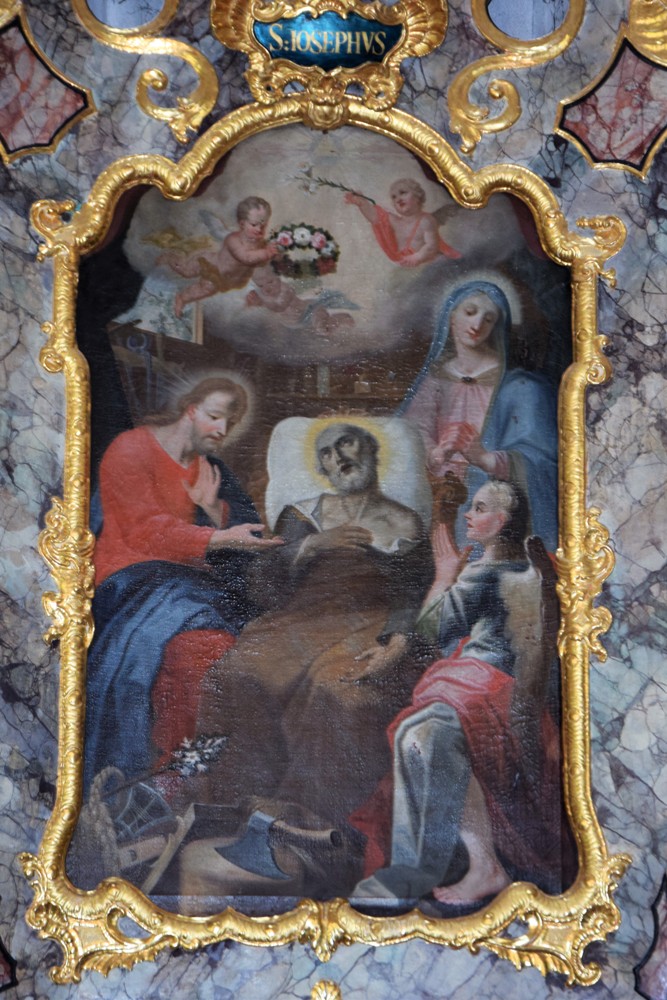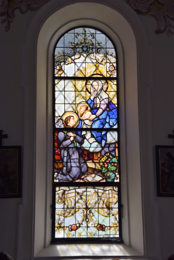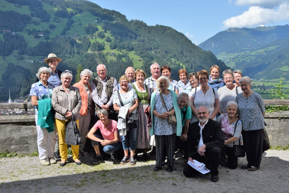 Nach der heiligen Messe in Bad Häring führte uns der Weg zunächst nach Zell am Ziller, wo wir in Hofers Wirtshäusl zu Mittag aßen, um dann zu Fuß oder mit dem Bus die Wallfahrtskirche Maria Rast aufzusuchen. Wir danken Herrn Dekan Dr. Ignaz Steinwender, der zum Mittagessen unser Gast war, dass er sich die Zeit genommen hat, uns diese bekannte Kirche und insgesamt die Pfarre Zell am Ziller vorzustellen. Seit etwa 360 Jahren ist Mariarast ein beliebter Wallfahrtsort, an dem im Jahreslauf regelmäßig Pilgergottesdienste gefeiert werden. Die Kirche liegt am Hainzenberg über Zell am Ziller, direkt an einem steilen Abhang - durch den Wald führt ein Fußweg entlang von Kreuzwegstationen, einer Lourdesgrotte und einer Ölbergkapelle hinauf. Den Mittelpunkt des Rokokoaltares bildet eine bekleidete Muttergottesstatue mit dem Jesuskind. Beeindruckend sind die Glasfenster und auch die Deckengemälde mit Szenen aus dem Marienleben. Das Gemälde an der Emporenbrüstung stellt die Weihe der Wallfahrtskirche dar.
