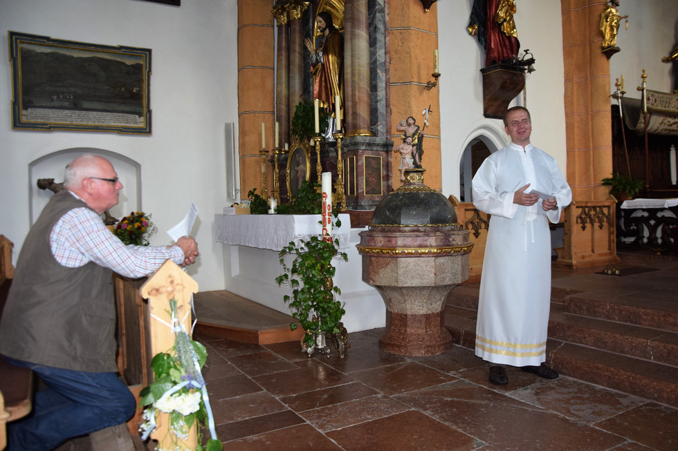 Anschließend erlebten wir eine landschaftlich beeindruckende Fahrt über den Gerlospass nach Bramberg - dort trafen wir uns zur Kaffeepause mit Herrn Pfarrer Stanislav Gajdos. Dieser freute sich sichtlich und zeigte uns danach die große Pfarrkirche, die dem hl. Laurentius und dem hl. Bartholomäus geweiht ist. Anschließend hielt er vor dem Allerheiligsten eine Marienandacht mit uns. Es war schön zu hören, dass er ab und zu mit ein wenig Wehmut an die Zeit bei uns zurückdenkt, obwohl er sich in Bramberg gut eingelebt hat, und ihm gute Erinnerungen geblieben sind. Mit einem Danke für diesen schönen Empfang, die Kirchenführung und die Andacht verabschiedeten wir uns von ihm und kehrten über den Pass Thurn und Kitzbühel wieder heim.