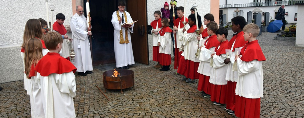 Eröffnet wird die Lichtfeier durch die Prozession mit der neuen Osterkerze zum Osterfeuer. Nachdem Herr Pfarrer Rainer Hangler es gesegnet hat, wird die Osterkerze bereitet und mit dem Osterfeuer entzündet. Mit dem dreimaligen Ruf "Christus, das Licht" wird sie schrittweise in den Altarraum getragen. Beim zweiten Ruf werden mit der Flamme der Osterkerze die Kerzen der Ministranten entzündet, sodass es allmählich heller in der noch wenig beleuchteten Kirche wird. Zur Weihe der Kerze beweihräuchert der Herr Pfarrer sie und singt das Osterlob.