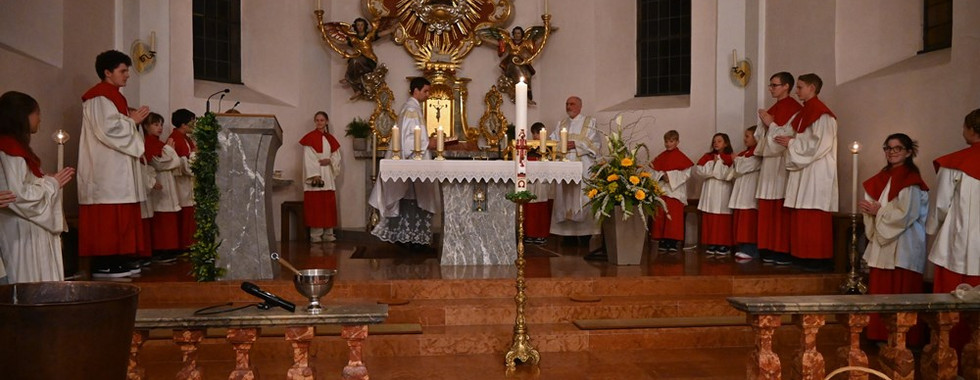 Nach dem liturgisch ruhigen Karsamstag kam am Abend allmählich Osterfreude auf, als wir nach Einbruch der Dunkelheit die Auferstehung Christi feierten: Während bereits das Feuer bereitet war, riefen die Ministranten mit den Ratschen zum Gottesdienst, bevor sie dem Priester und dem Diakon voran durch die dunkle Kirche auf den Kirchvorplatz zogen. Herr Kooperator Klaus Pirchmoser segnete das Feuer und bereitete neue Osterkerze, ehe sie entzündet wurde. Mit dem dreimaligen Ruf "Christus, das Licht" erfolgte der Einzug in die Kirche und die Ministranten entzündeten ihre Kerzen mit dem Osterlicht. So wurde spürbar, wie Christi Licht die Dunkelheit durchbricht. Herr Kooperator Klaus Pirchmoser sang das Osterlob, das die Schuld des Menschen glücklich preist, damit die Erlösungstat Christi geschehen konnte.