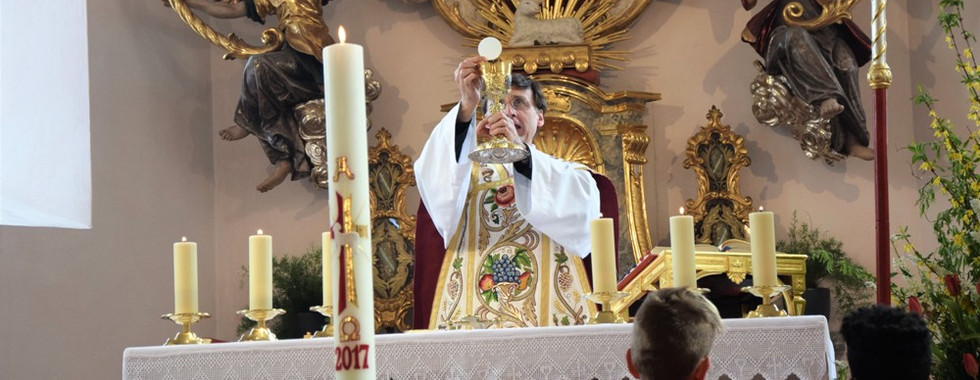 Mit sehr vielen Ministranten zog Herr Pfarrer Rainer Hangler in den Kirchenraum ein und begrüßte nach der feierlichen Inzensierung des Altares die Feiergemeinde. In seiner Ansprache blickte er noch einmal zurück auf die vergangenen Tage, denn das Fest der Auferstehung Christi lässt sich nicht trennen von den Kartagen: Beim Letzten Abendmahl am Gründonnerstag zeigte Jesus den Aposteln mit der Fußwaschung, einander zu dienen und einander zu lieben, er feierte in Kontinuität der jüdischen Tradition das Paschamahl und setzte anschließend die Eucharistie ein: In Brot und Wein schenkt er uns seinen Leib und sein Blut, um uns von allen Sünden zu erlösen, und die Apostel sollen dies zu seinem Gedächtnis tun - bis in die heutige Zeit ist Jesus in der Eucharistiefeier gegenwärtig. Am Karfreitag offenbarte sich die Herrlichkeit Gottes in der Liebe Christi am Kreuz - in seinem Tod, um die sündige Menschheit zu erlösen. Blut und Wasser flossen aus der Seite - Zeichen für die Eucharistie und die Taufe, zwei Sakramenten, aus denen die Kirche erwächst. Nach der Ruhe des Karsamstages durften wir in der Osternacht Christus als das Licht erfahren, das uns durch die Taufe ein neues Leben in Gott schenkt. Für die Jünger war das leere Grab etwas, das sie erst allmählich begreifen und verstehen lernen mussten: Der Auferstandene ist außerhalb der irdischen Zeit und nicht gebunden an einen bestimmten Ort. Der Glaube daran wuchs allmählich - auch wir sollten aus diesen Glauben Hoffnung und Kraft schöpfen.