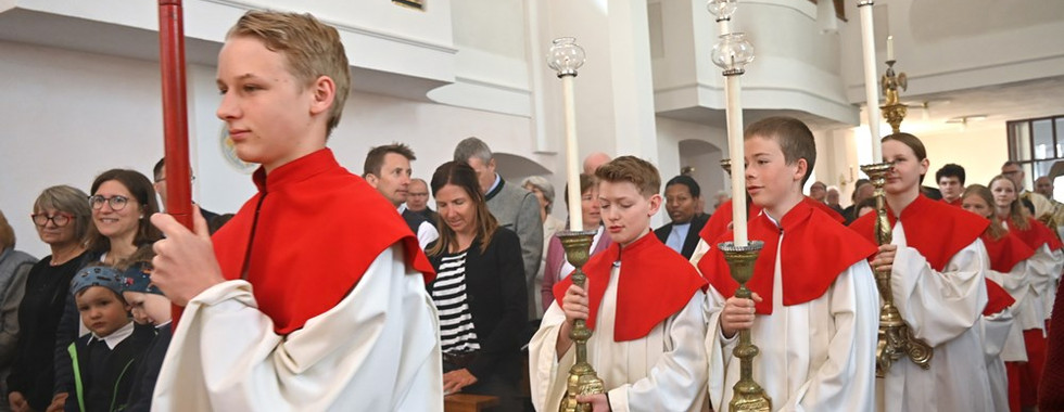 Durch den besonderen Kirchenschmuck, die vielen angezündeten Kerzen, die Speisenkörbe, die im Quergangbereich bereitgestellt wurden, das frisch gesegnete Weihwasser neben dem Taufstein und die Osterkerze in der Mitte spürte man eine österliche freudige Stimmung. An diesem Tag zogen die Ministranten mit Herrn Pfarrer Stefan Schantl und Herrn Diakon Stefan Mair im sogenannten großen Einzug vom Hauptportal in die Pfarrkirche ein und füllten den Altarraum.