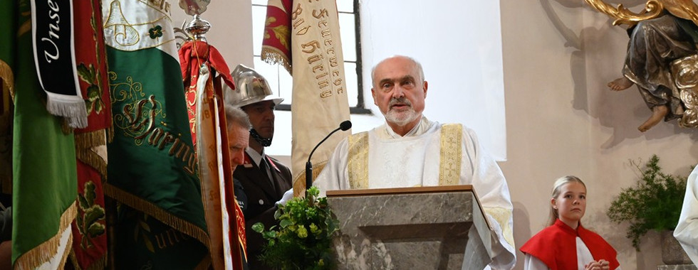 Am Seelensonntag begrüßte Herr Kooperator Klaus Pirchmoser besonders die Vereine, die jedes Jahr auf Einladung der Gemeinde der Opfer der beiden Weltkriege gedenken. In diesem Jahr fiel dieser Sonntag auf den Festtag der Weihe der Lateranbasilika. In seiner Ansprache ging Herr Kooperator Klaus Pirchmoser zunächst auf das Evangelium ein - auf die Vertreibung der Händler aus dem Tempel. Jesus möchte, dass unsere Kirchen Orte des Gebetes sind, in der wir Gemeinschaft spüren, wenn wir Gottesdienst feiern. Der Begriff Kirche betrifft aber auch unser Inneres - spätestens seit der Taufe wohnt Gott in uns. Es liegt an uns, ihm den nötigen Raum zu geben und dies auszustrahlen. Nach der Eucharistiefeier bedankte sich Herr Diakon Franz Reinhartshuber für das Mitfeiern und lud zur Andacht auf dem Friedhof ein. Dort gedachte Herr Kooperator Klaus Pirchmoser mit Gebeten der Opfer der Weltkriege und bat um Frieden für die heutigen Kriegsgebiete. Nach der Ehrensalve der Schützenkompanie erfolgte die Kranzniederlegung - verbunden mit der Bitte von Herrn Bürgermeister Hermann Ritzer, den gefallenen Soldaten möge die Erde leicht sein. Für die passende und festliche musikalische Umrahmung der Messe und der Gedenkandacht danken wir der KMK Bad Häring.