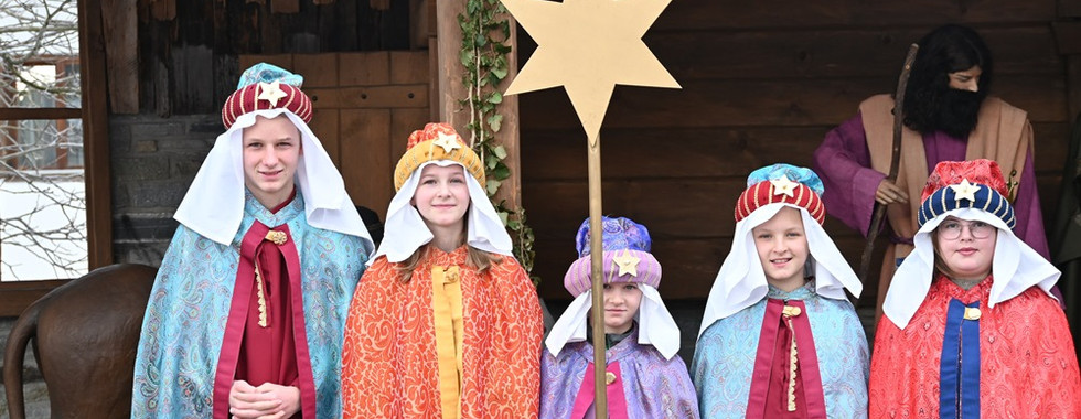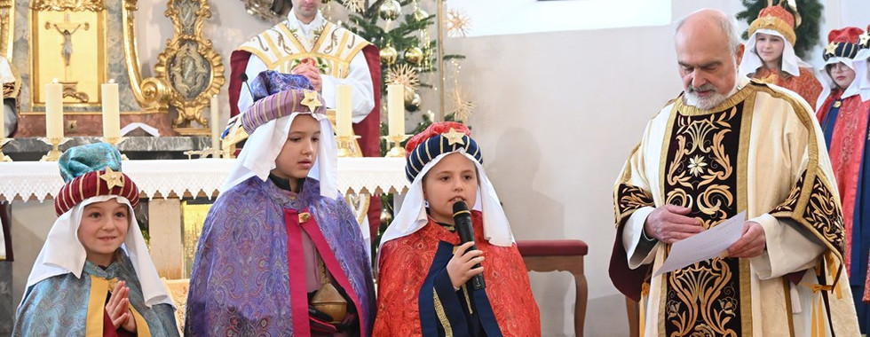 Mit dem Festgottesdienst zu Dreikönig erfuhr die Sternsingeraktion einen feierlichen Abschluss. Herr Kooperator Klaus Pirchmoser zelebrierte mit Herrn Diakon Franz Reinhartshuber und Herrn Diakon Stefan Mair die heilige Messe, unterstützt von den ministrierenden Königen. In seiner Ansprache bedankte sich Herr Diakon Franz Reinhartshuber bei den Kindern und Jugendlichen, bei allen Begleitern, bei den Tischfamilien für das Mittagessen und den Pizzabäckerinnen sowie den Eltern für die Unterstützung der Aktion. Er hob die Bedeutung des Segens hervor, den die Sternsinger in die Häuser gebracht hatten, und die Kunde von der Geburt Christi. Die Weisen waren mit wachem Herzen dem Licht des Sternes gefolgt, in der Erwartung, einen neuen König zu finden, der ihr Leben hell machen würde. Sie fanden Gott als Kind und ließen sich berühren - wie die Hirten brachen auch sie wieder auf und verkündeten die Geburt Christi. Heute können wir das tun - als Sternsinger, aber auch, wenn wir unser Herz auf Gott ausrichten. Einige Könige hatten sich mit Texten vorbereitet: Lesung, Fürbitten und Vorstellung der drei Gaben der Weisen.