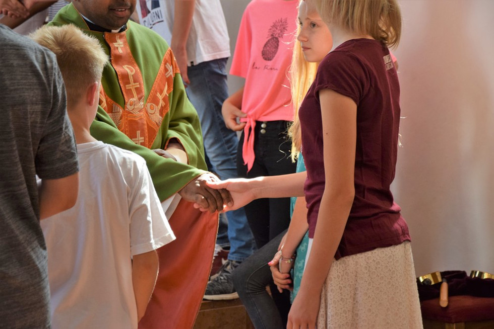 Herr Kaplan Binu John lud alle Kinder und Jugendlichen ein, sich zum Vater unser um den Altar zu versammeln und auch dort einander die Hände zum Frieden zu reichen