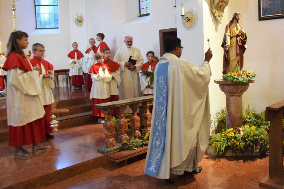 Die Vorabendmesse zum Hochfest der Aufnahme Mariens mit Leib und Seele in den Himmel, bei der wir uns von Herrn Kooperator Dr. Binumon John verabschiedeten, wurde von einer festlichen und würdigen Stimmung getragen - in die wir als Feiergemeinde viele Anliegen einbrachten. Freude und Dank, Sorgen und Tod standen ganz nahe beieinander - was Herr Diakon Franz Reinhartshuber in seiner Ansprache in Verbindung mit der Aufnahme Mariens in den Himmel brachte, an die uns unser Altar immer erinnert, wenn wir die Kirche betreten und bewusst schrittweise nach vorne gehen. Demütig hat Maria aus Gottes Hand Freude und Leid angenommen und ist uns zum Vorbild geworden, damit auch unser Weg zum ewigen Sein in Gottes Liebe führt. An die Entschlafung Mariens erinnert auch die Kräuterweihe - dafür, dass dieser Brauch bei uns so schön gepflegt wird, danken wir den Bäurinnen.